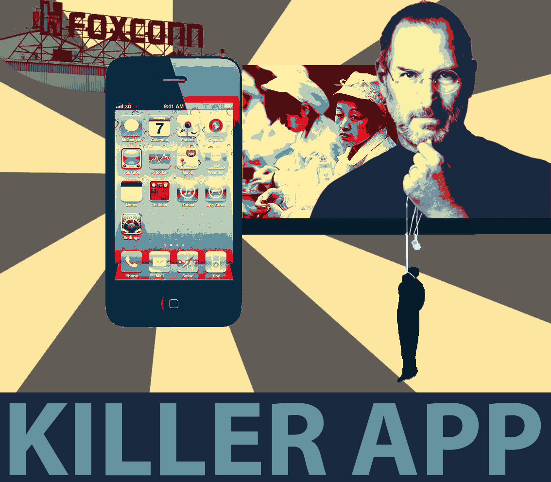 “Killer App” has a few different meanings. On one hand, “killer app” has often been used to describe a popular Apple application – indeed, a game changer, and many applications in the Apple Store describe themselves as such. On another level, it points to the application process that the workers at Foxconn go through in order to get a job that may end up killing them physically (suicide or otherwise). And finally, the “killer” part of the text also points to the dehumanization of the manufacturing process. With “kill” being an action to cease life, I hope people will take it a step further to interpret it as stripping a human of their humanity for the capitalistic gains of a dominant empowered entity – in this case, Apple.